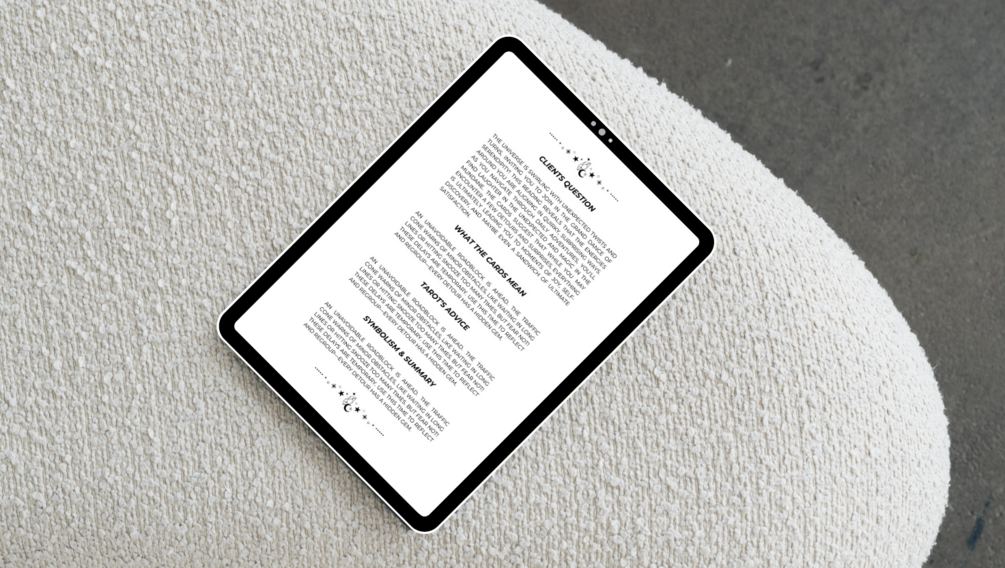 This template is crafted to elevate your client experience, providing space for everything from images of card spreads to an “About Your Reading Style” page that allows clients to understand your unique approach. With three unique style options, editable fonts, colors, and layouts, this template is a versatile asset that aligns with your brand, making each reading feel personal and professional. Easy to use and fully customizable, it’s a seamless way to present your readings with polish and purpose.