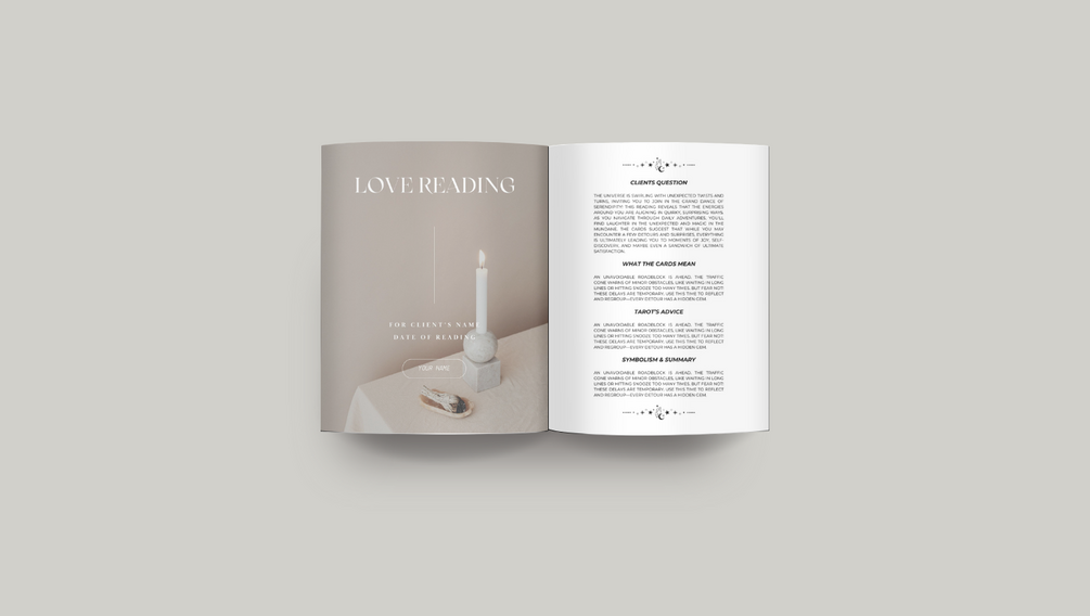 This template is crafted to elevate your client experience, providing space for everything from images of card spreads to an “About Your Reading Style” page that allows clients to understand your unique approach. With three unique style options, editable fonts, colors, and layouts, this template is a versatile asset that aligns with your brand, making each reading feel personal and professional. Easy to use and fully customizable, it’s a seamless way to present your readings with polish and purpose.
